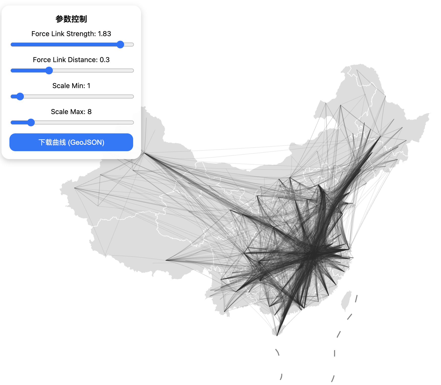函数返回一个包含边捆绑后几何结果的 GeoDataFrame,其属性包括原始边的全部字段及对应的空间几何 (LineString)。结果的坐标参考系为 “EPSG:4326”,可直接用于 GIS 可视化或空间分析。