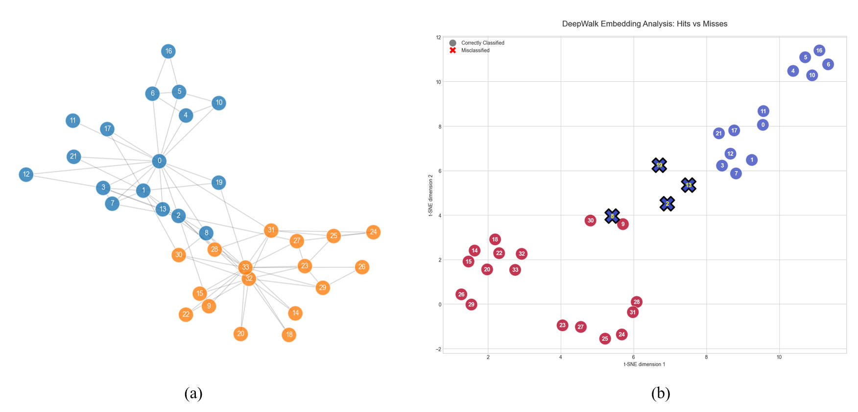 可以加载著名的 Toy Dataset 空手道俱乐部网络。其图结构可以被可视化为图2(a)。在下面的代码实践中,我们需要设计一个DeepWalk类,包含多次随机游走生成序列,并利用 gensim 库的 Word2Vec 类实现训练 Skip-gram 模型