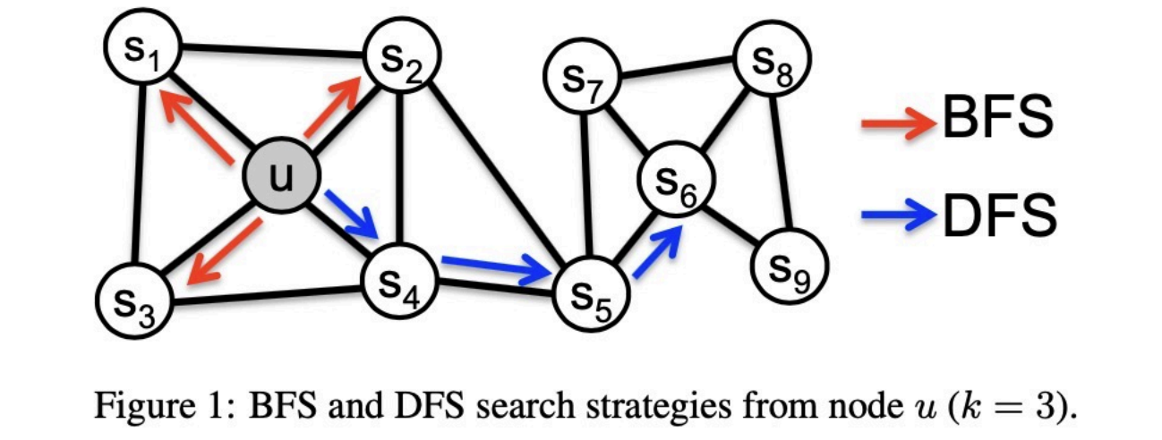 同质性强调物以类聚,即距离相近、同属一个密集社区的节点应当具有高度相似的表征;要捕获这种特征,游走策略需要倾向于深度优先搜索(DFS),以探索社区的宏观边界。相反,结构等价性关注节点在网络拓扑中所扮演的角色(如中心枢纽或边缘节点),即使两个节点在物理空间上相距甚远,只要它们的局部网络结构相似,其表征亦应趋同;捕获这一特征则要求游走策略偏向广度优先搜索(BFS),以充分描绘节点的微观邻域轮廓。